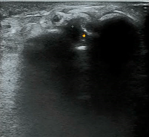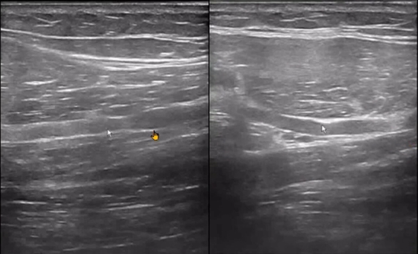 The handheld ultrasound machine showed significant swelling and thickening of the deep branch of the radial nerve, with disrupted and non-continuous nerve structures.