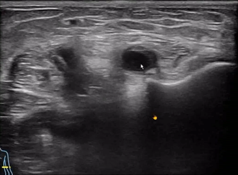 The handheld ultrasound machine indicated ulnar nerve compression in the right upper limb, likely due to synovial proliferation within the cubital tunnel and an external nerve sheath cyst in the forearm.