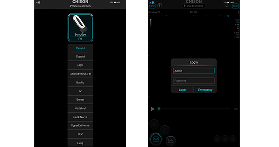 Once you connect SonoEye to your mobile device, the app will launch automatically, leading you to the preset screen.Select the "Emergency" to begin scanning immediately if there is no need to log in to a specific personal account.